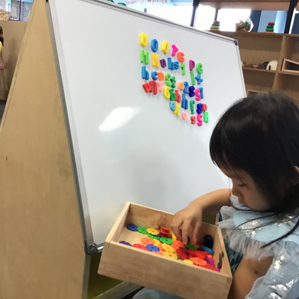 There is maths in everything; counting in cooking, walking, lining up cars, adding coloured squares to a collage, washing babies. There are shapes in the windows, sandwiches, door knobs, plug holes, house roofs and everywhere. Spatial concepts are learnt through where they stand, go through an obstacle course or hang upside down on the climbing frame. There is grouping, ordering, sequencing, adding and subtracting in everything they use, put away and take out. They learn about measurement when they compare their heights, fill a small beaker from a large pot, watch how far their balls, kites and paper planes will fly. You name it, they can count it, measure it, describe it, observe it and problem solve it. And they do, as they play, because our teachers notice and draw their attention to it as they work.